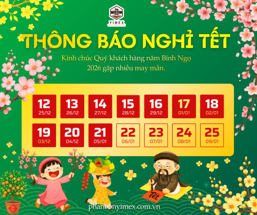 THÔNG BÁO – LỊCH NGHỈ TẾT BÍNH NGỌ 2026 Để thuận tiện hơn cho Quý Khách hàng, YIMEX trân trọng thông báo lịch nghỉ Tết Nguyên Đán như sau: Thời gian nghỉ từ ngày 12/02 đến hết 21/02/2026 Tức 25/12 âm lịch tới hết mồng 5 âm lịch xuân Bính Ngọ Thời gian hoạt động trở lại: Ngày 22/02/2026 (nhằm mùng 06 Tết âm lịch) Cảm ơn Quý Khách Hàng đã luôn tin tưởng và đồng hành cùng YIMEX suốt một năm qua. Kính Chúc Quý Khách Hàng và Gia Đình một năm mới BÌNH AN- SỨC KHOẺ- THỊNH VƯỢNG! ...